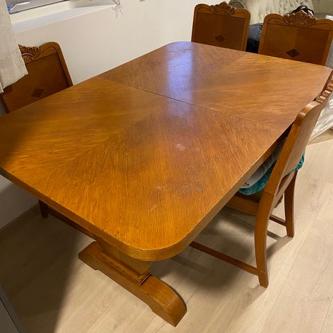Pent brukt spisebord i heltre fra IKEA. 5 spisestoler følger med. Pent og solid spisebord til 6-8 personer.
