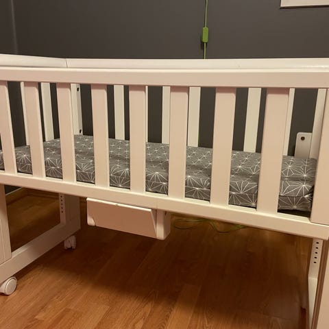 Selger bedside crib til baby 0-6mnd i hvit farge. Høyde kan justeres og hjulene følger med.