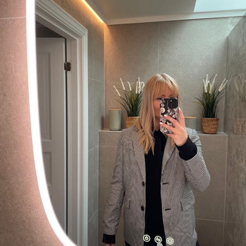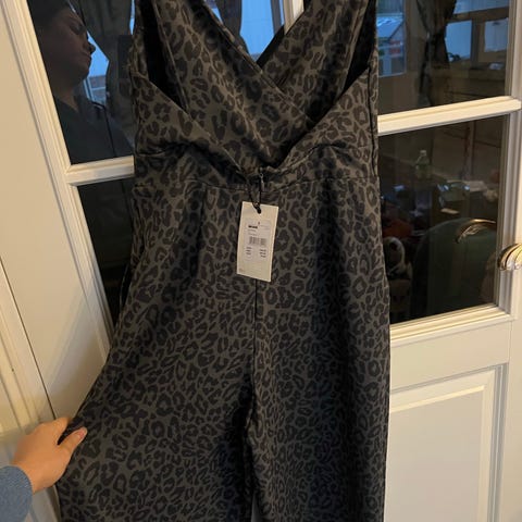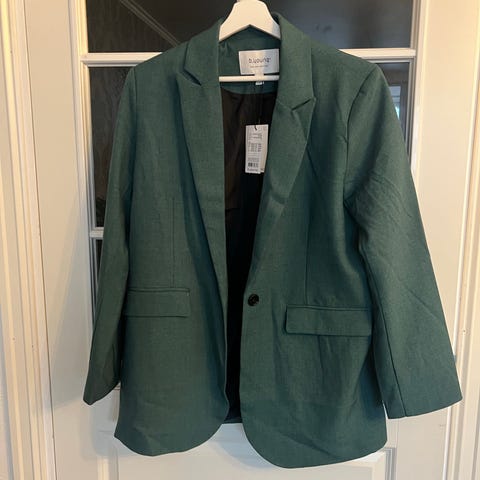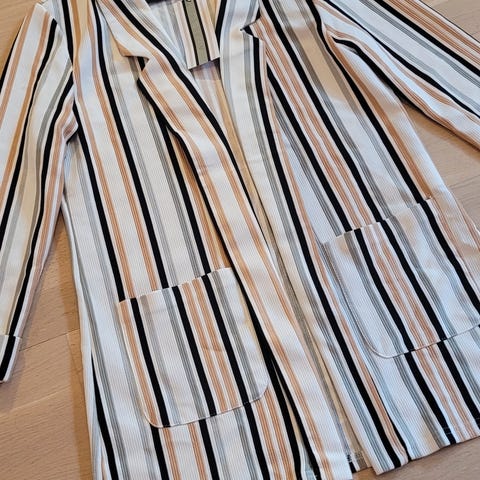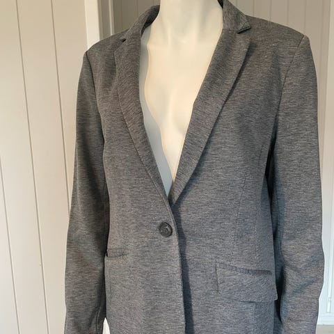blazer i mørke blå fløyel materiale, størrelse 34. Jakken har en dobbelspent knappelukking og lommer foran. Passer til kvinner.