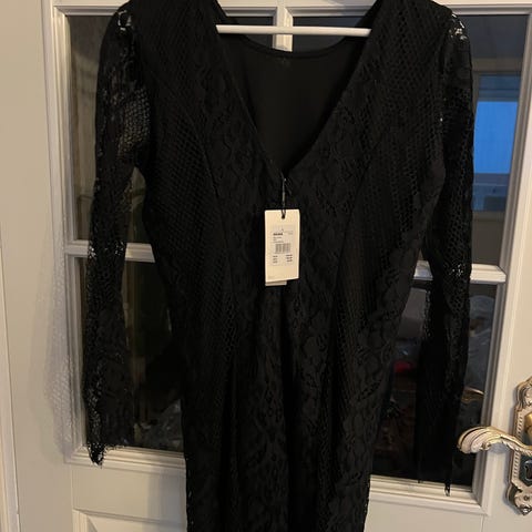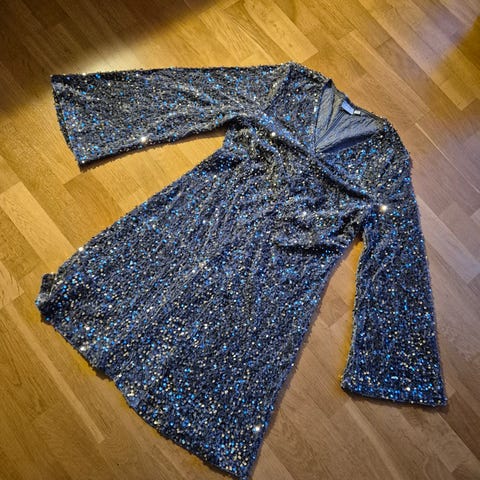 festkjole i svart fløyel, størrelse 42 for damer. Kjolen har lange ermer og detaljer med perler ved halsen og ermene. Egnet for formelle anledninger.