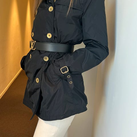 Burberry Brit jakke i 100% lammeskin. Størrelse 36, farge svart. Jakken har knapper og belte i livet, samt glidelåsdetaljer på ermene. Utseende har et trenchcoat preg. Innerfôr med karakteristisk Burberry-mønster.