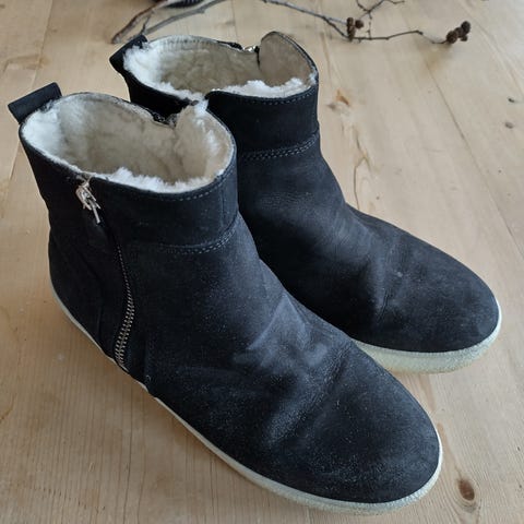 Semsket, grå skinnstøvlett fra det norske merket Lune. Str 40. Støvlettene er litt foret og de er pent brukt. Det er mye sko igjen i dem. Saueskinn av god kvalitet.