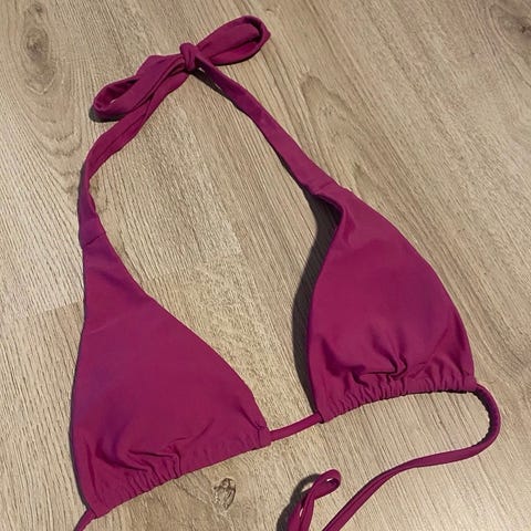 Supersøt rosa bikini overdel i størrelse L. Knyting både i nakken og bak på ryggen. «Sløyfen» i midten kan også knytes som man vil, så den kan gjøres penere. Pent brukt og uten bruksmerker.