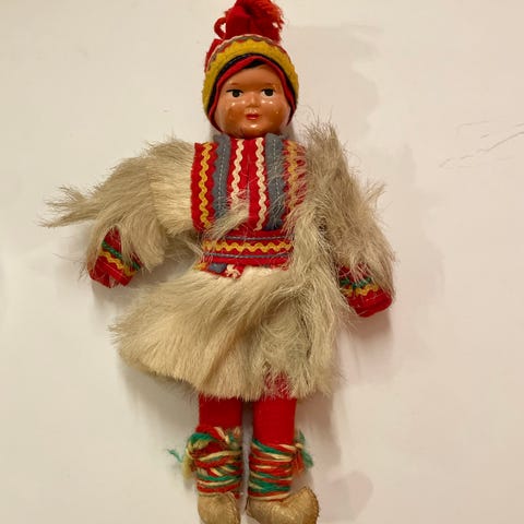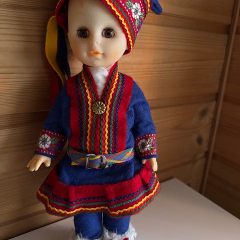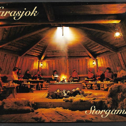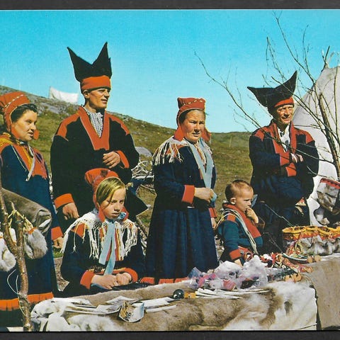Postkort med motiv av samisk tradisjonell drakt, viser mann og kvinne i tradisjonelle klær. Meget pent, ubrukt storformat, se bilder
