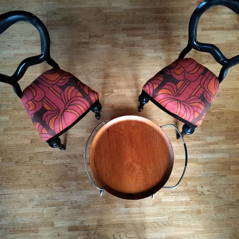 3 stk antikk stoler og krakk med oppbevaring selges.