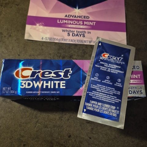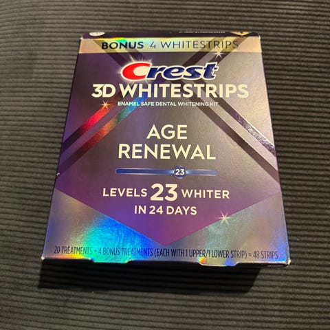 Selger Crest 3D Whitestrips for effektiv tannbleking hjemme.