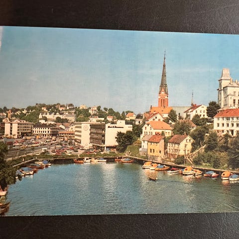 Postkort med 4 bilder fra Arendal, inkludert bylandskap og havn. Strøkent, ubrukt storformat, se bilder