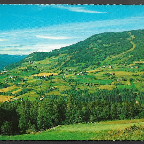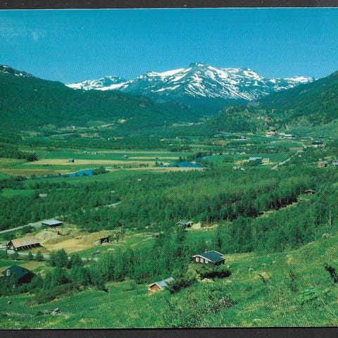 Postkort med motiv fra Gol i Hallingdal. Viser et landskap med fjell og spredte hus. Pent, ubrukt storformat, se bilder