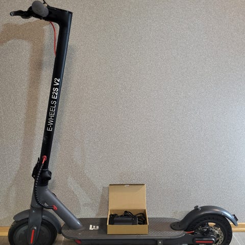 Elektrisk sparkesykkel E-Wheels E2S V2. PRO Long Range. Lader inkludert. Maksimal hastighet 30 km/t(Ulovlig).På én batterilading kan scooteren kjøre ca. 30 km. Nye hjulene er oppblåst med luft for en komfortabel tur Alt fungerer som det skal. Selge slik de er.