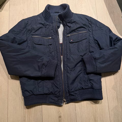 Original Tommy Jeans vinterjakke i mørk blå med rød innside. Varm og lett vattert, fast hette, glidelåslukking og praktiske lommer. Klassisk passform, egnet til hverdagsbruk høst og vinter.