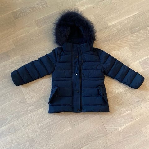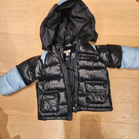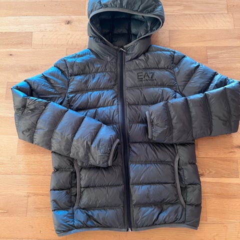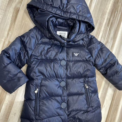 Armani dunjakke for barn i størrelse 94 (Armani sin str.), unisex. Jakken er blå og laget av dun, noe som gir god isolasjon og varme. Den har hette, egnet for kalde værforhold.