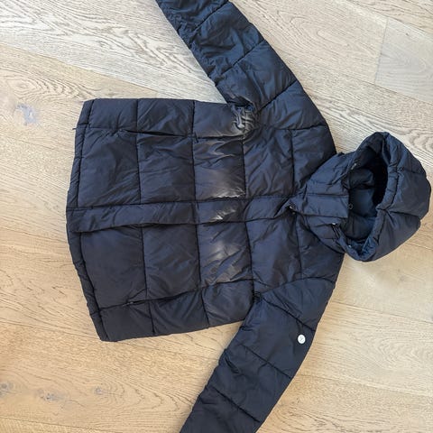Har toveis glidelås og to innerlommer. Knepping utenpå glidelås. Hette kan ikke tas av.
