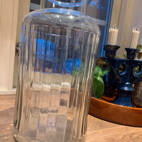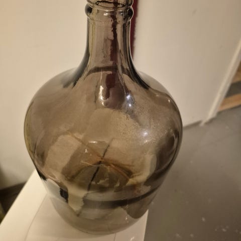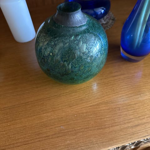 Dekorasjonsvase i grønn og brun farge. Vasen har en avrundet form med smal åpning, egnet for dekorative formål i hjemmet.