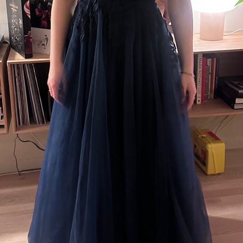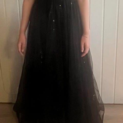 Ballkjole selges. Brukt en gang. Størrelse s-m. Mål rundt midje: 70cm, men har snøring bak som kan strammes. Passer 165-170cm.