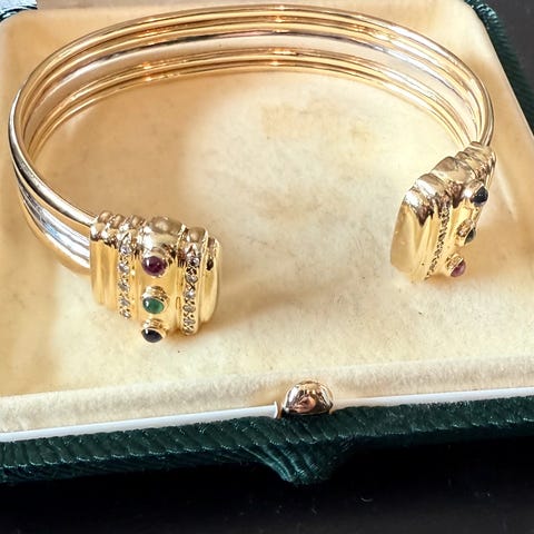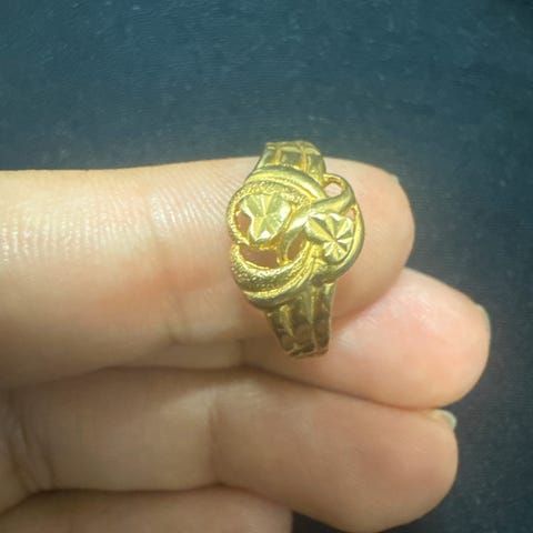 Fint brukt 23 karat, 96.6 prosent rent gull. Den er myk så "pent brukt" ok forhold til det. Dette er en unik ring. Den veier 1.79 gram. Prisen er i nok