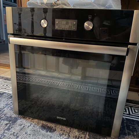 Siemens Annet komfyr med rustfritt stål og svart front. Komfyren har flere stekebrett og ovnsrom med glassdør.