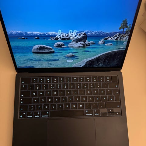 Apple MacBook Air M2 2022 bærbar PC med 8-kjerners CPU, 8-kjerners GPU, 8 GB RAM og 250 GB lagringskapasitet. Maskinen har en 13,6-tommers Liquid Retina-skjerm.