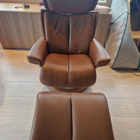 Selger en original Ekornes Stressless lenestol med tilhørende puff, produsert i Norge. Stolen er trukket i skinn og har klassisk Stressless-komfort med god støtte for rygg og nakke.