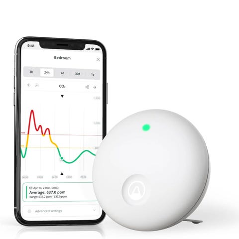Leier ut en Airthings wave plus med flere sensorer. Den måler: