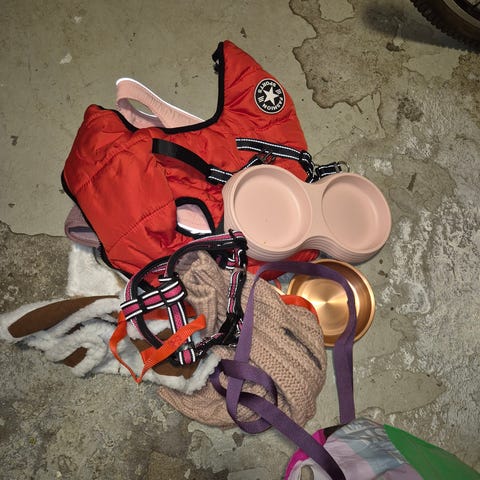 A pair of still dog food bowls and a plastic one