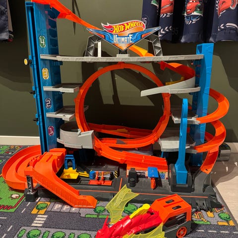 Hot Wheels Ultimate bilbane med flere nivåer og ulike baner for bilkjøring. Inneholder ramper, heis og ulike kjørefunksjoner. Designet for barn som liker bilbaner og lek med biler.
