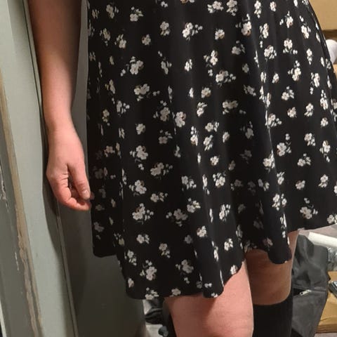 Pen kjole fra Floyd med pen utrigning og splitt. Når den passet var den sykt fin på. Midjen har et stykke stoff vannrett for å fremheve midjen litt. Utrigningen er forsterket med en "stål innretning" lik noe som er i en bh så den holder sin fine form hele tiden. Det er en underkjole i kjolen for at kjolen skal ligge penere.