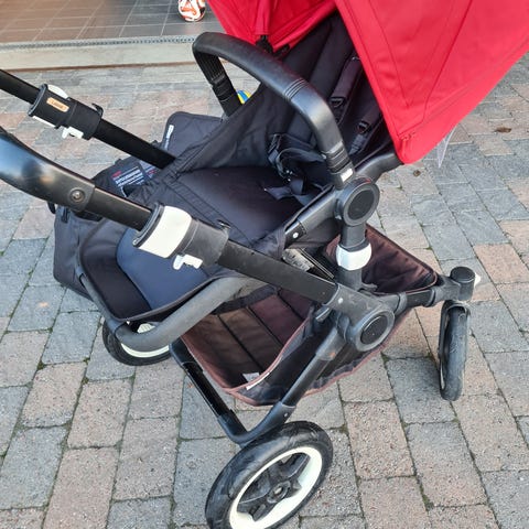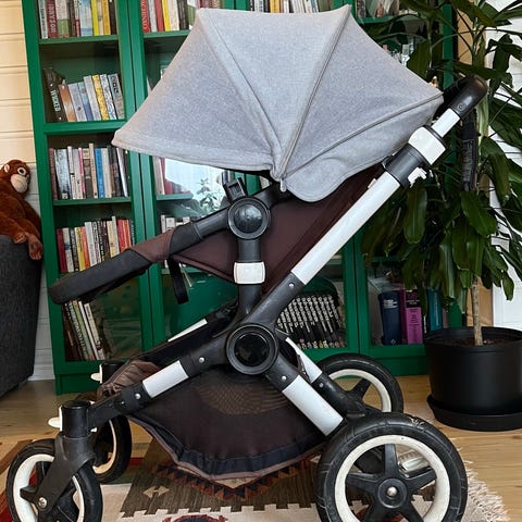 Bugaboo barnevogn tilbehør i fargene svart og lys grønn. Sittedel, liggende og hette/skjerm.