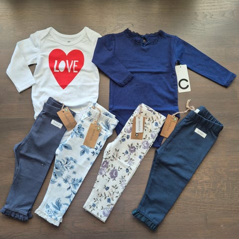 Stor klespakke jente i størrelse 68. Inneholder ulike plagg i flere farger og mønstre, i forskjellige materialer.
