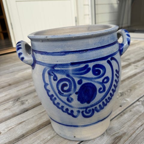 Tysk keramikk krukke med blå dekor, to håndtak, og en rund form. Krukken har en grå basefarge med blå mønsterdetaljer. Den er egnet for oppbevaring eller dekorasjon. Krukka er 16 cm høy og 12 cm i diameter på toppen. Rommet 1,8 liter.