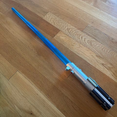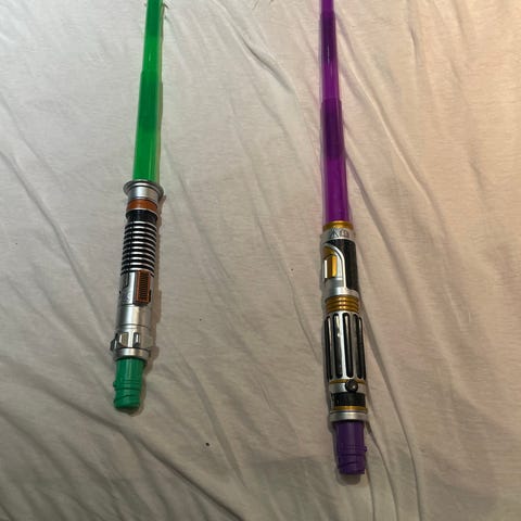 Star Wars lyssverd med lyd- og lysfunksjon. Elektrisk. Ekstra lydeffekt ved bevegelse og treff. Et grønt og et blått sverd. Tilbehør til å koble sammen sverd til ulike modeller følger også med.