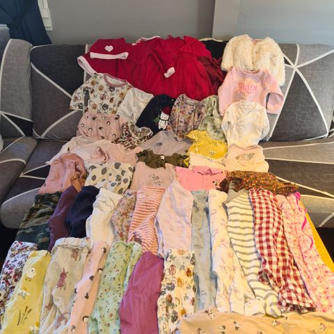 Stor klespakke jente i størrelse 68. Inneholder ulike plagg i flere farger og mønstre, i forskjellige materialer.