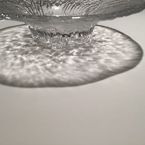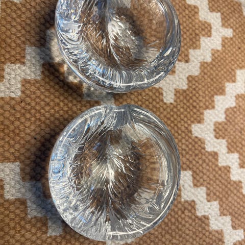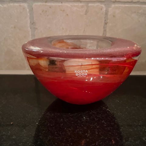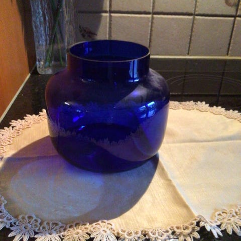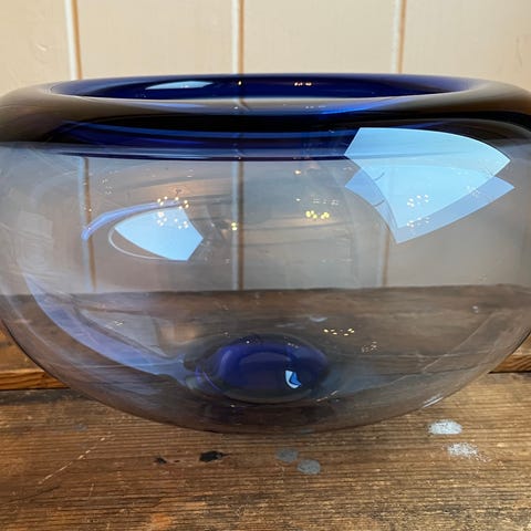 Lite brukt blå Per Lütken Provence-skål, designet i 1955. Skålen har en diameter på 25 cm og er laget av munnblåst glass som er formet for hånd. Denne skålen kan brukes som fruktskål, til salater eller som pynt. Hver Provence-skål er unik og blåst uten bruk av en form. Skålene varierer derfor i form og størrelse. Produksjonen av Provence-skålen er i seg selv en helt unik opplevelse.