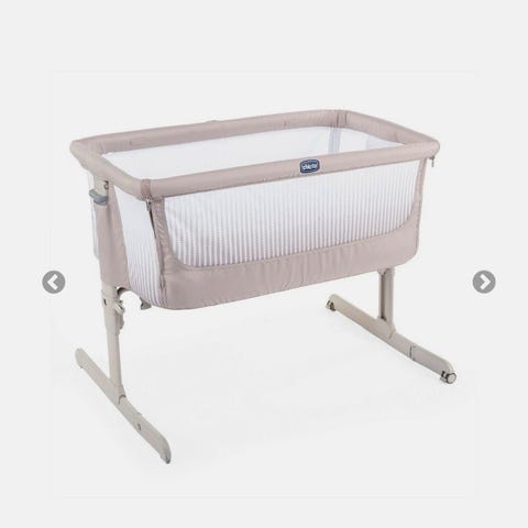 Svært lite brukt (stått på en hytte) bedside crib i en beige farge. Har et merke i stoffet som ikke går bort i vask (se bilde). Inkluderer madrass og et hvitt ubrukt jersey laken.
