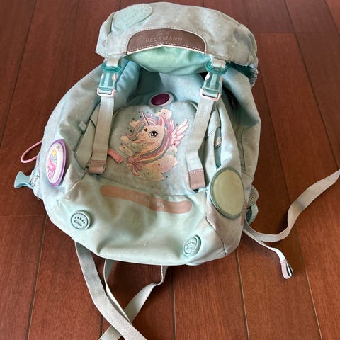 Pent brukt skolesekk, noen få bruksmerker, se bilder. Et par hull i regntrekket, ellers ingen skader.