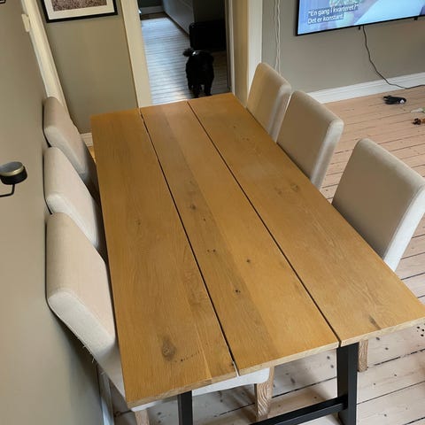 Jeg selger spisestuebord med to ileggsplater (hver på 40 cm; fullt utslått blir bordet 240 langt).