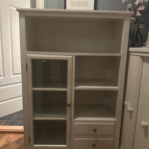Fint skap plass til glass og service, 2 skuffer til bestikk.