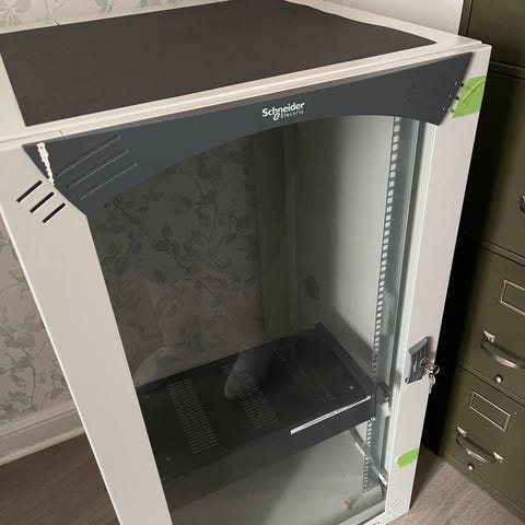 This cabinet comes standard with 63% perforated doors and detachable steel side panels, all of which can be locked. The cabinet comes pre-assembled with adjustable legs. You can choose between the colors RAL 7035 grey or RAL 9005 black.