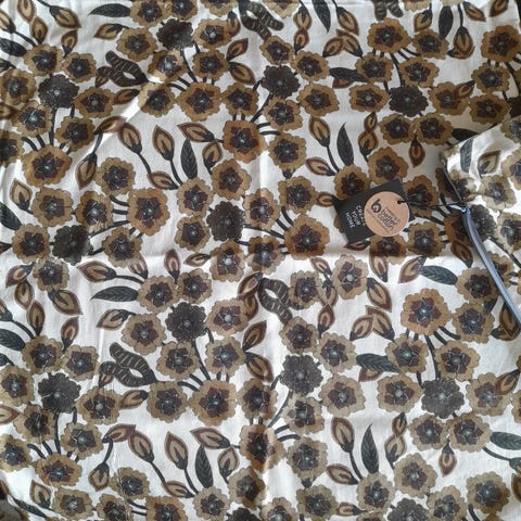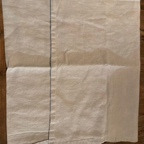 Brun på ene siden og offwhite på den andre. 40x60 cm. 60% bomull, 40% lin. Kommer fra et røyk og dyrefritt hjem. Selges samlet.