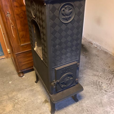 Trolla 104 vedovn laget i støpejern. Ovnen har en dør med luftregulering og en plate på toppen for koking eller oppvarming. Passer til bruk i mindre rom eller hytter.