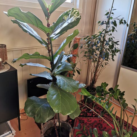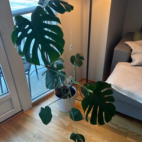 Stor monstera, den er ikke stabil og trenger et plantestøtte og en større potte. Dekorative potte og stative er ikke inkludert i prisen.