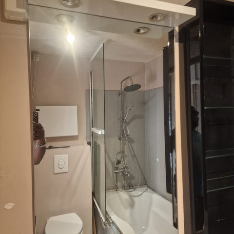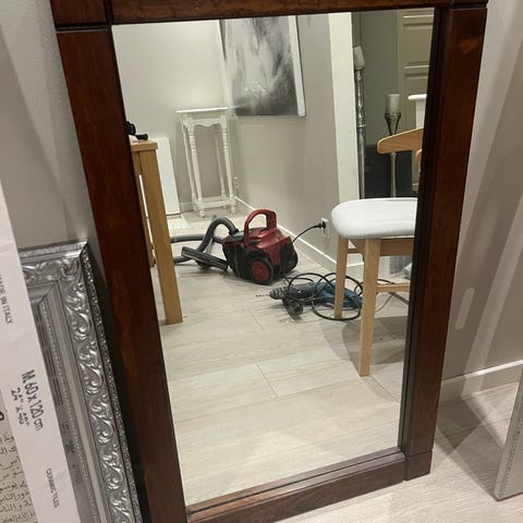 To speil-skyvedører, en liten skade nederst på den ene (se bilde). Litt slitasje på den ene hyllen inne på høyresiden (se bilde).