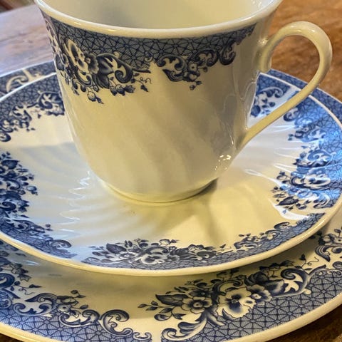 5 stk. blå/brun/beige kaffekopper med skål selges.