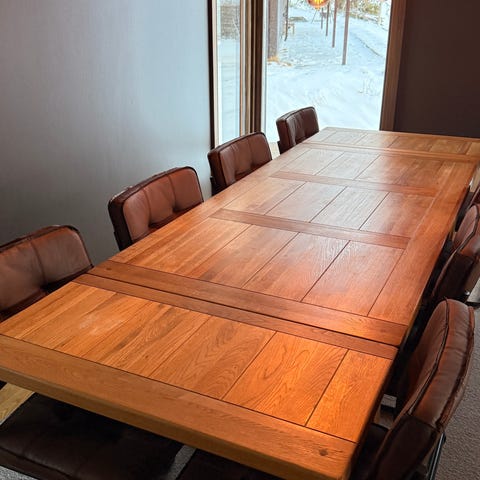 Selger det fine spisebordet mitt grunnet flytting. Det ble kjøpt brukt på Finn for en tid tilbake, så jeg vet lite om produktet. Trevirket ser ut som lys oljet eik. Noen ubetydelige bruksmerker her og der, som jeg tenker går naturlig inn i treverket- men det er smak og behag. Veldig stødig og fint bord.