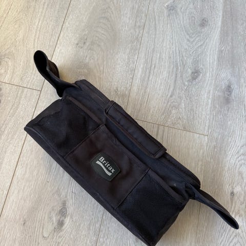 Designet for å festes på barnevognens håndtak. Festes med velcro. Flere lommer og to koppholdere. Godt brukt men mye bruk igjen. Lukter litt kjeller da den har blitt oppbevart der en stund.
