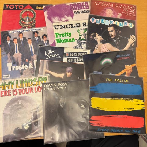 En del vinylssingler. Emily Starr - back to the Beatles, Ry Cooder . Bop till you drop, Men at work, Herman Hermits, The Archies osv. 10 kr. stk eller 100 for alle.