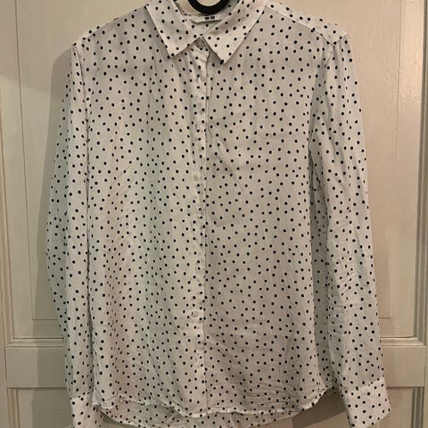 Deilig og lekker Uniqlo skjorte i lysblå farge, laget av lin. Størrelse S for dame. Kan også brukes av M. Skjorten har lang erme og klassisk krage, kun prøvd på da jeg har samme i både hvit og i mørkeblå.
