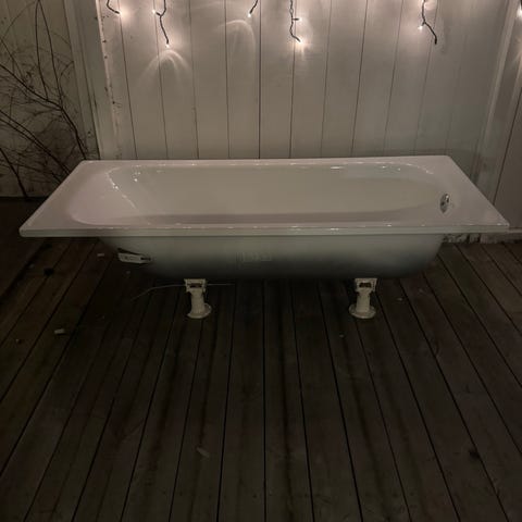 Hjørnebadekar i hvit akryl med avrundet design. Passer for hjørneplassering i baderom. Målt bredde ca. 100 cm, lengde ca. 140cm. Må hentes!