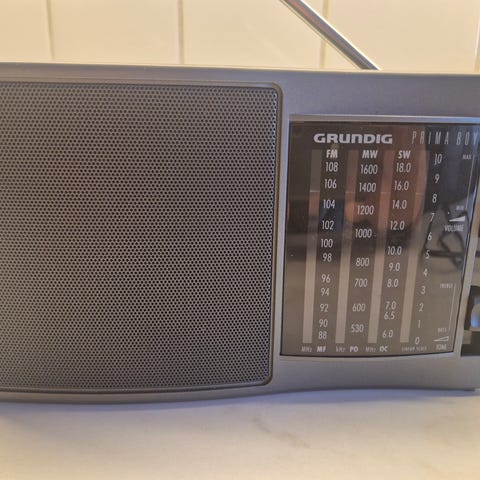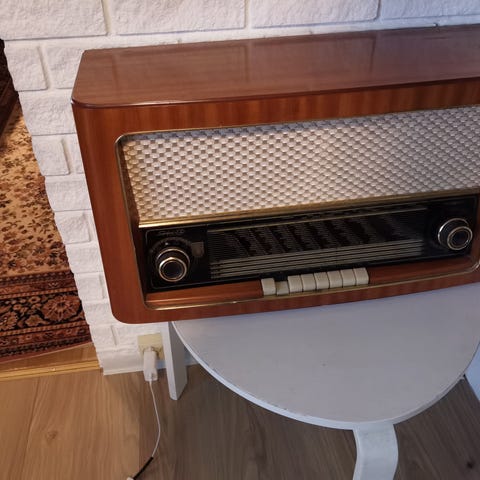 Airmec London England vintage radio med tre justeringsknapper og et analogt display for frekvensinnstillinger. Enheten har et klassisk design med en frontpanel som kombinerer et mønstret høyttalergitter og et frekvensvindu. Baksiden viser tilkoblingsmuligheter og tekniske spesifikasjoner.