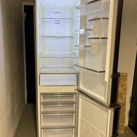 Bosch kombiskap innebygget,med kjøleskap og fryser. Innredet med glasshyller og dørhyller for oppbevaring. Hvit farge og standard størrelse for kjøkkenbruk.