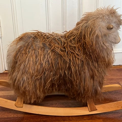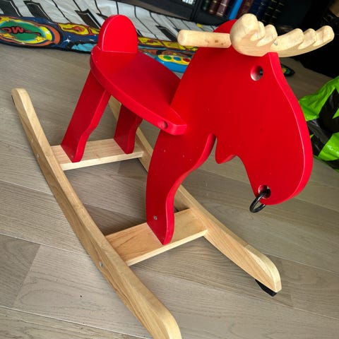 En «gyngesau» laget av tre med ekte saueskinn over. Den fungerer som en gyngestol for små barn, men brukes også som dekorasjon i hjemmet. De er kjent for å være solide og har en unik, håndlaget kvalitet. Nypris 6595 kr.
